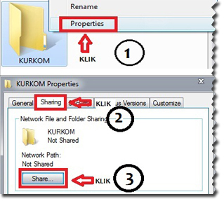 Langkah ke 1-3 (Klik Propertis>Sharing>Share)