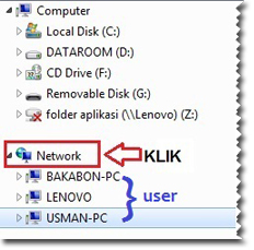 Sampai dengan langkah ini setting sharing folder telah selesai, selanjutnya silahkan sobat buat folder khusus untuk file sharing di semua komputer user yang sudah terhubung ke jaringan komputer dan tempatkan file yang akan dishare pada folder saharing tapi sebelumnya pastikan semua user memiliki hak akses atas file tersebut. Sekarang semua komputer telah terhubung dan folder sharingpun telah disiapkan, cara membuka folder sharingnya tidaklah begitu sulit, sobat tinggal explore aja komputernya lalu klik Network dan pilih akun user yang mau dibuka folder sharingnya. Perhatikan gambar berikut :